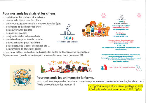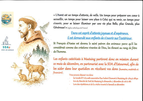 Les enfants de Mastaing partiront donc en mission durant ce mois de décembre, en partenariat avec la SDA d’Estourmel, aidés de tous les copains catéchisés de la paroisse, afin d'aider le refuge dans son quotidien en récoltant des dons (humains, matériels et financiers) que vous pourrez déposer :