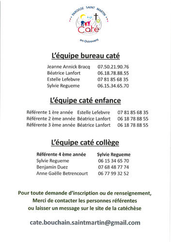 Vous pouvez dès à présent et jusque que fin septembre inscrire votre enfant au caté. Vous rencontrerez une personne qui vous renseignera et répondra à vos questions. Puis vous serez invité à participer à la réunion de parents fin septembre pour la mise en route de l'année de caté.